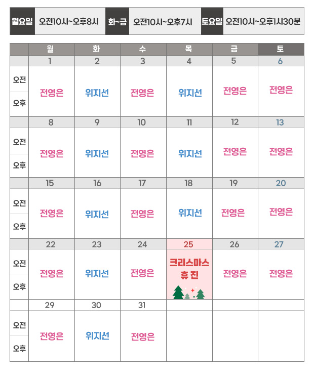 | 토요일 | 오전10시 ~ 오후1시30분 |