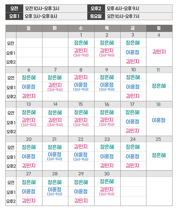 | 토요일 | 오전10시 ~ 오후7시 |