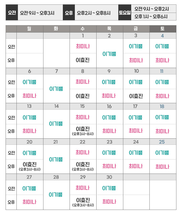 | 토요일 | 오전9시 ~ 오후6시 |